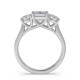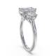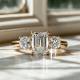 Three diamonds sit in an arrangement in this trilogy design. The rectangular step-cut stones create clean lines and a hall-of-mirrors effect across the finger. The setting showcases each stone's clarity and precise angles whilst the band provides a sleek foundation. Explore all of our engagement rings.