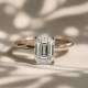 The rectangular diamond features step-cut facets that create a hall-of-mirrors effect, offering subtle brilliance. Our four-prong setting showcases the stone's elegant proportions and crystal-clear clarity. The sleek band complements the diamond's architectural style, creating a look that's polished and refined. Explore all of our engagement rings.