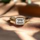 A metal rim frames the rectangular emerald diamond in this bezel set design. The clean edges complement the stone's step-cut facets. The band connects seamlessly to the frame, creating an unbroken line that's comfortable for everyday wear. Explore all of our engagement rings.