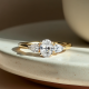 The elongated stones create a flowing line across the finger whilst delivering brilliant sparkle. The setting holds each stone securely and the band provides a comfortable base for daily wear. This style carries symbolic meaning through its three-stone arrangement with elegant proportions. It works for those who want sentiment paired with a softer silhouette. Explore all of our engagement rings.