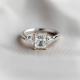 Three diamonds form a striking row in this trilogy design. The rectangular stone with trimmed corners deliver brilliant sparkle whilst maintaining a modern geometric profile. The setting holds each stone firmly and the band provides a structured base for everyday wear. It suits those seeking noticeable sparkle with clean lines.
